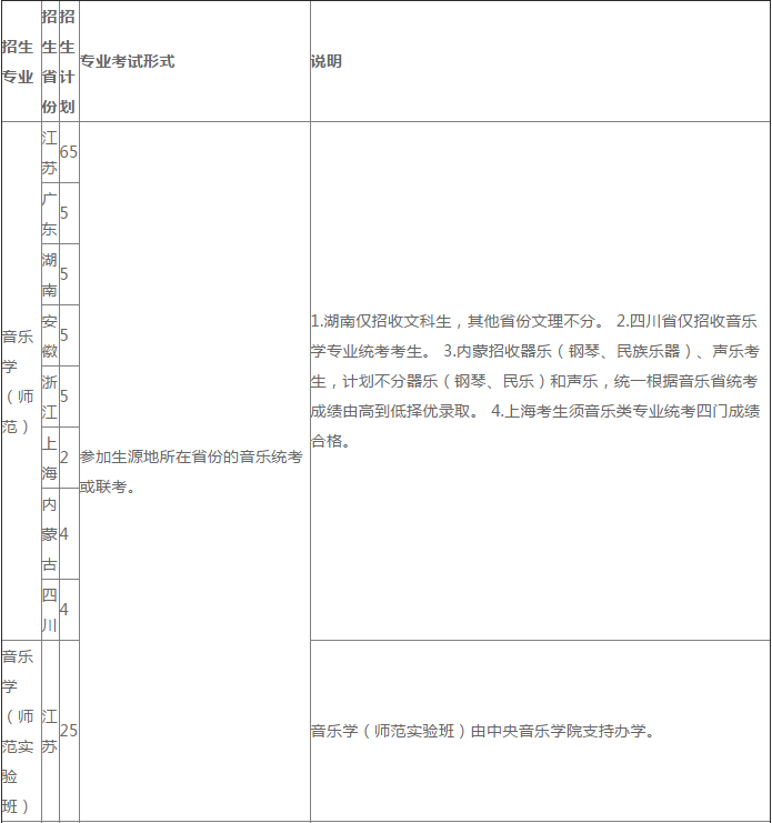 2. 对报考南京师范大学音乐学(师范)专业,且高考文化分和专业分(统考或联考)均达到考生生源地所在省同批次同类型最低控制分数线的浙江、广东、湖南、安徽、内蒙古(只招收器乐(钢琴、民族乐器)、声乐考生)、四川、上海等7省进档考生,录取时将根据各省专业统考或联考的专业分从高到低的顺序择优录取;若专业分(统考或联考)相同,则按高考文化分从高到低的顺序择优录取;若高考文化分仍相同,则按语文、数学、外语3门科目的原始分之和从高到低的顺序择优录取。
