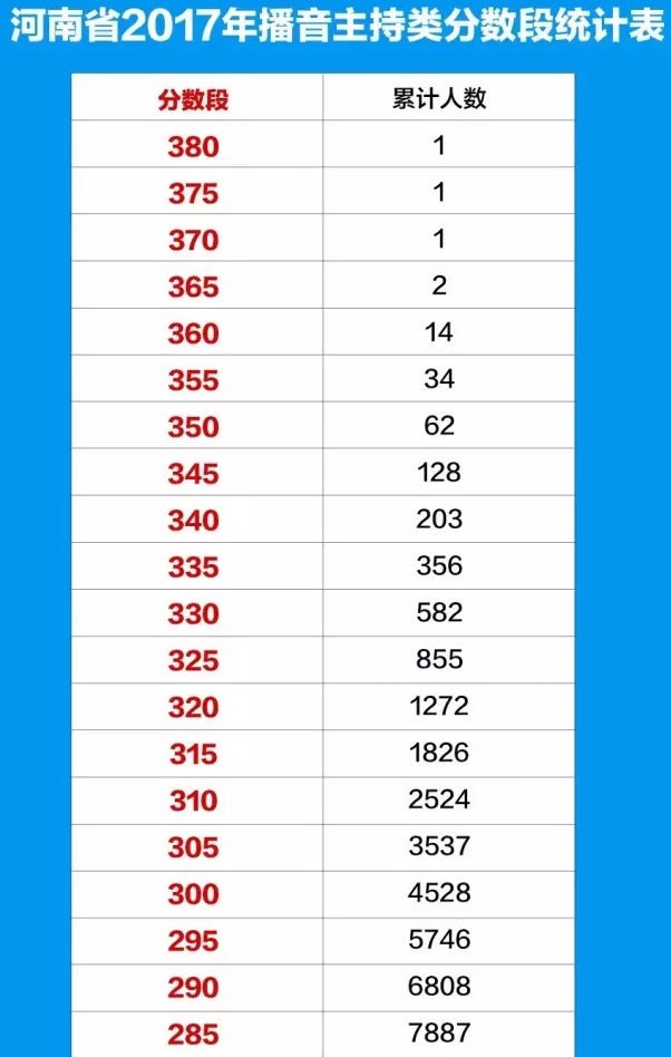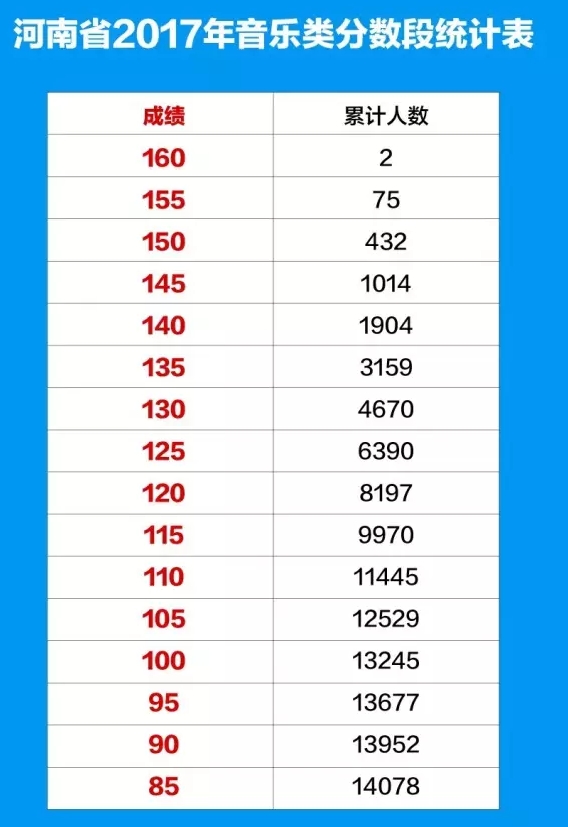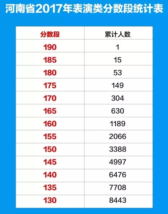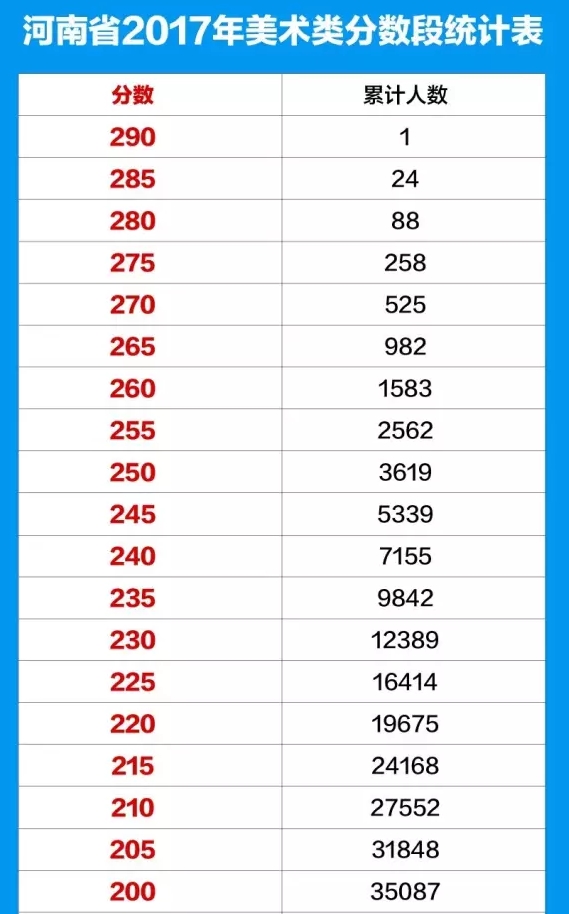 河南省2017年普通高招艺术类成绩公布。河南省2017年艺术类分数段统计表: